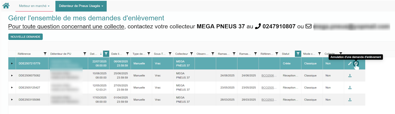 Depuis mon compte Aliabase, dans le tableau de gestion des demandes d’enlèvement, cliquez sur le bouton d'annulation permet d'annuler la demande de collecte.