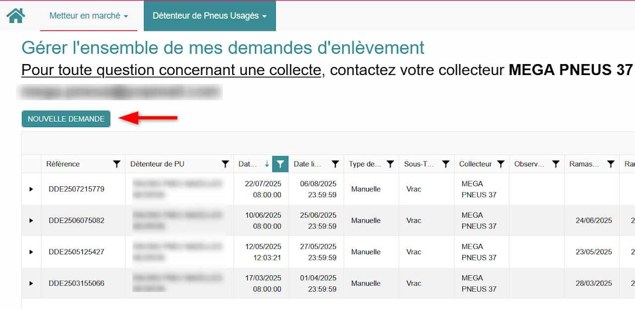 Une fois connecté à Aliabase, je clique sur le bouton Nouvelle demande dans l'onglet Détenteurs de Pneus Usagés > Demandes d'enlèvement
